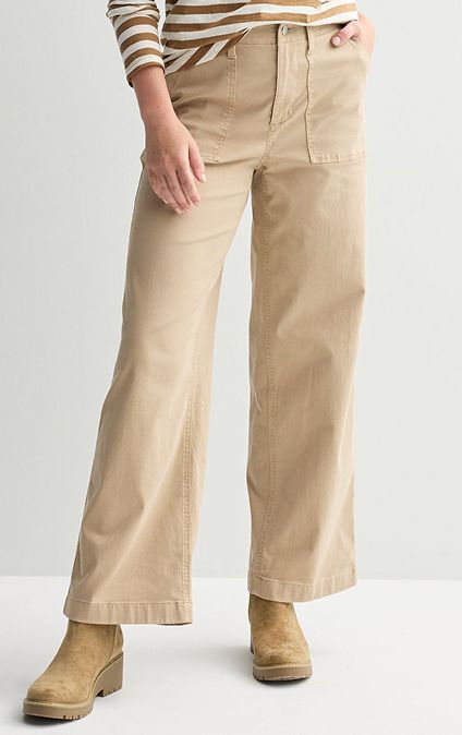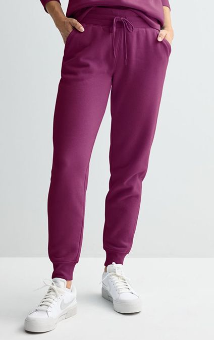 Wider at the ankle than boot cut legs, this style is ideal for creating the illusion of curves and providing a balance for wider hips. | Look sharp in women's wide-leg dress pants that start widening at the hips for extra room and provide a chic day-to-night look. | A more comfortable option, joggers are perfect for lounging around or commuting in a relaxed, fashionable look. |