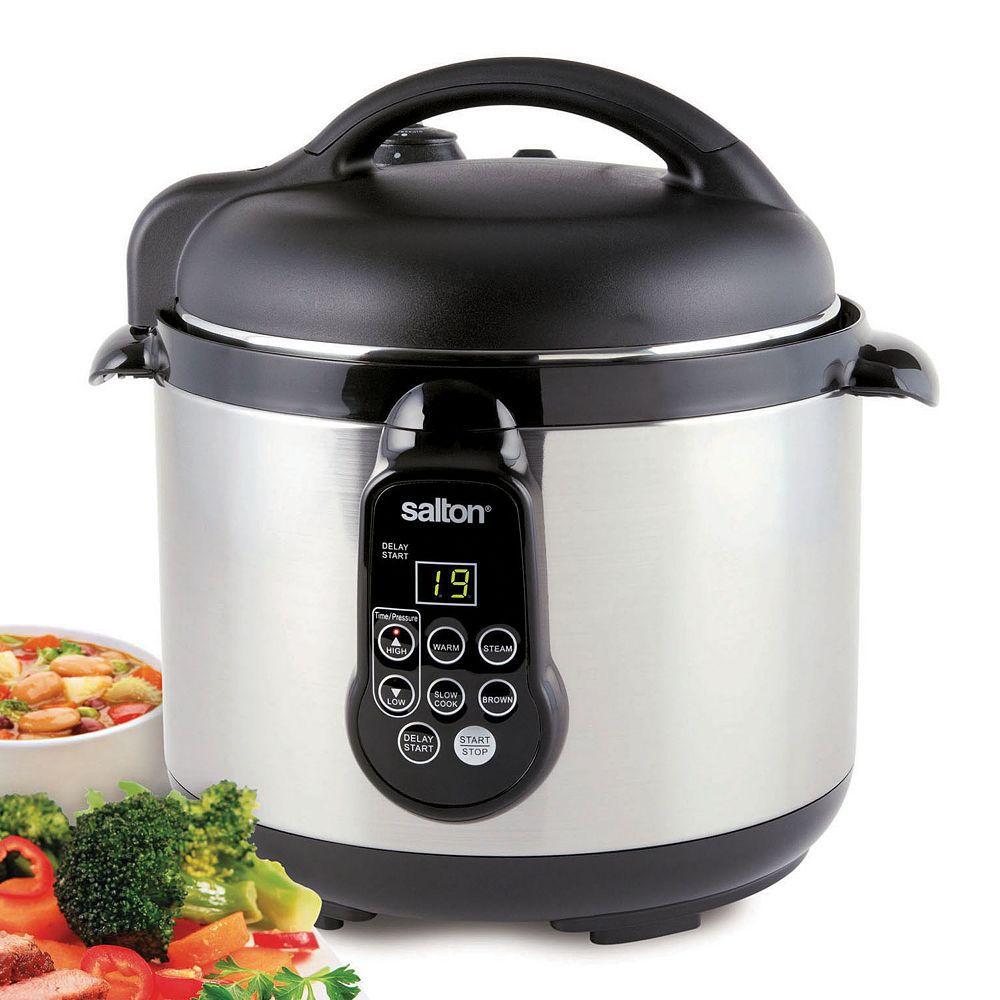 Save on time by cooking quick, delicious meals with this sleek Salton 5-in-1 electric pressure cooker.