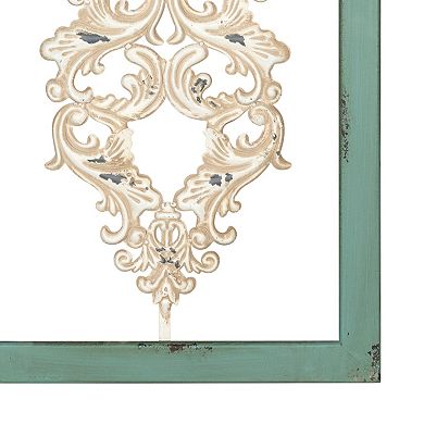 - Create a stunning new focal point in your home with this scroll ornament which features graceful filigree details, bordered by an elegant wooden frame and a distressed finish. Its teal shade sets a serene and calming tone in your indoor space.•Made of MDF and metal, this traditional wall decoration livens up your wall with its teal and white colors, and a distressed finish.•Measuring 36.00 W x 0.75 D x 16.00 H inches, this wall ornament can hang horizontally or vertically on your wall thanks to its sturdy keyhole hangers.•Clean the surface of this handcrafted scroll decor piece with a damp piece of cloth to get rid of any dust, dirt, or smudges.•Let this decor piece take the traditional look of your bedroom, living room, hallway, or entryway to greater heights.•With its elegant filigree design, this handcrafted wall ornament makes your home look more sophisticated right away.