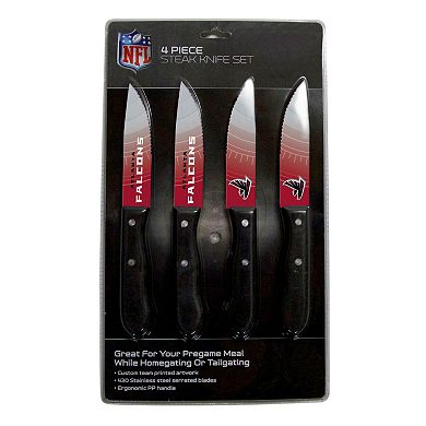 - Includes 4 heavy-duty steakhouse quality steak knivesCustom team printed artwork on both sides of knives430 stainless steel serrated bladesErgonomic polypropylene handle with double riveted design Easy to clean- hand wash for best resultsOfficially Licensed