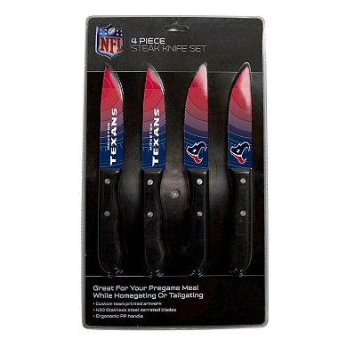 - Includes 4 heavy-duty steakhouse quality steak knivesCustom team printed artwork on both sides of knives430 stainless steel serrated bladesErgonomic polypropylene handle with double riveted design Easy to clean- hand wash for best resultsOfficially Licensed
