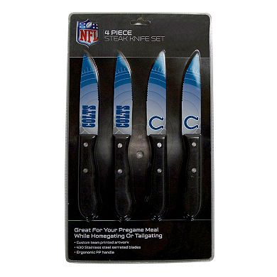 - Includes 4 heavy-duty steakhouse quality steak knivesCustom team printed artwork on both sides of knives430 stainless steel serrated bladesErgonomic polypropylene handle with double riveted design Easy to clean- hand wash for best resultsOfficially Licensed