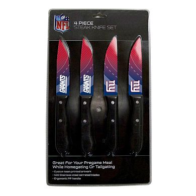 - Includes 4 heavy-duty steakhouse quality steak knivesCustom team printed artwork on both sides of knives430 stainless steel serrated bladesErgonomic polypropylene handle with double riveted design Easy to clean- hand wash for best resultsOfficially Licensed