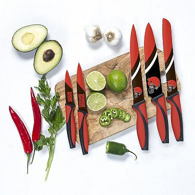 - Includes 5 knives- paring knife, utility knife, carving knife, bread knife and chef's knifeCustom team printed artwork on both sides of knives430 stainless steel bladesErgonomic polypropylene handle with non-slip gripEasy to clean- hand wash for best resultsOfficially Licensed