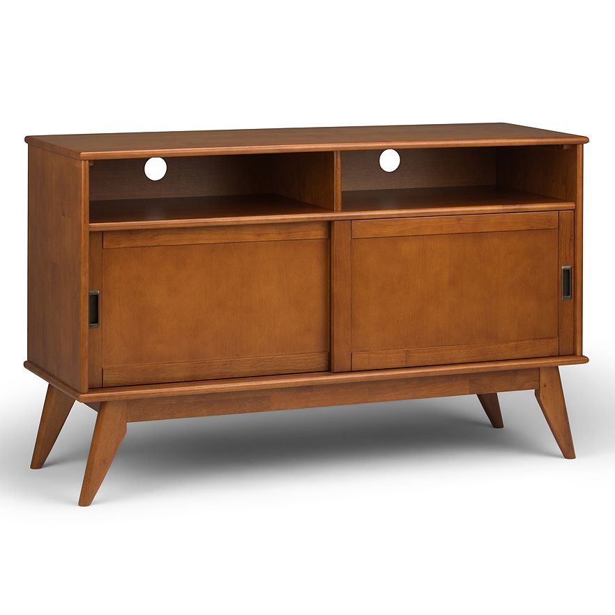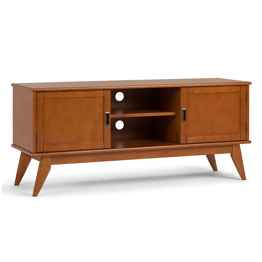 Keep all your multimedia items in one place with this amazing Simpli Home Draper mid-century TV stand.