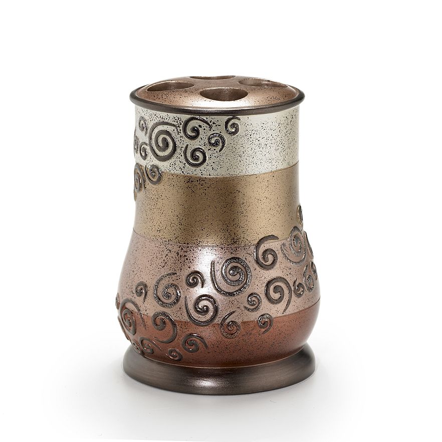 - Bronze-tone pump and raised swirl accents add modern appeal.