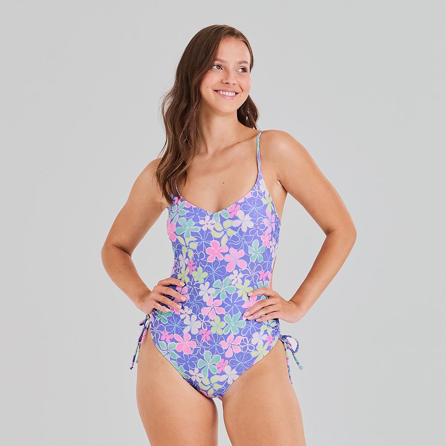 Get ready for the beach, pool, or the summer season with this juniors' Ninety-Nine° aloha bliss adjustable shirred one-piece swim suit.