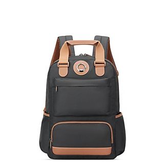 This Flanerie backpack from DELSEY PARIS features tote handles and padded back straps for carrying, a padded laptop compartment, and a tote band to slide the bag over the trolley tubes of your matching luggage.