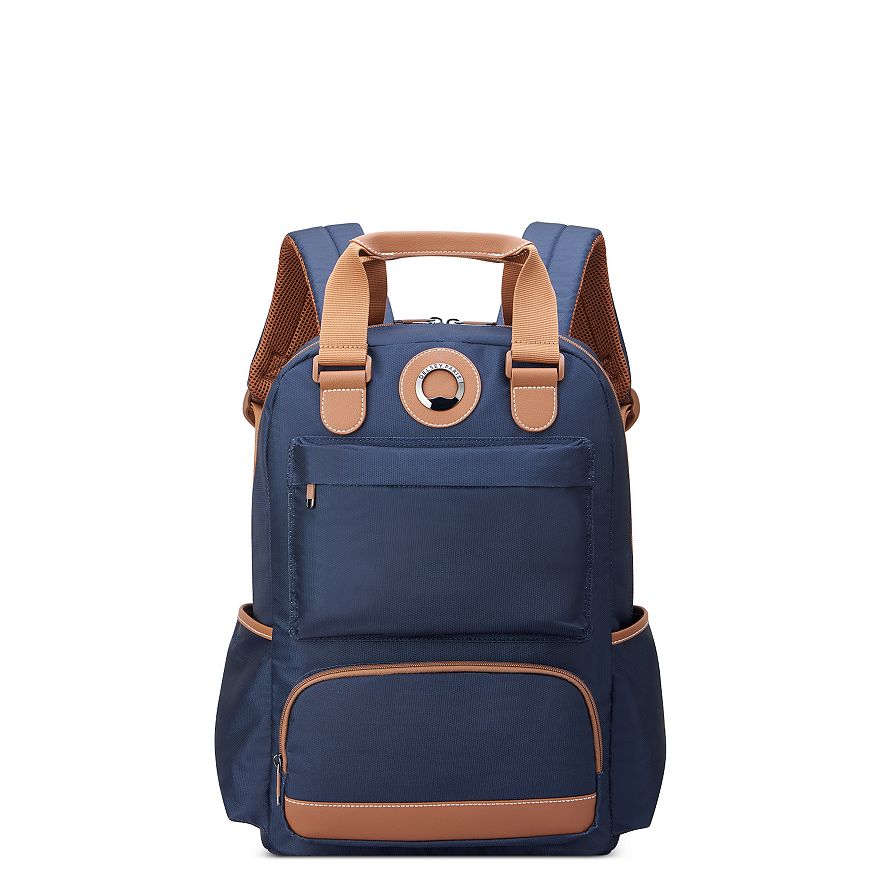 This Flanerie backpack from DELSEY PARIS features tote handles and padded back straps for carrying, a padded laptop compartment, and a tote band to slide the bag over the trolley tubes of your matching luggage.