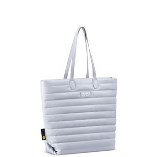 This puffy jacket inspired tote is the perfect add-on to your luggage, or to your personal bag collection! The lightweight tote will slide perfectly over your shoulder or the trolleys of your luggage, using the luggage band on the back.
