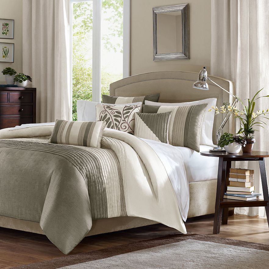 The elegant pintuck details combined with leaf, scroll and striped accents on this Madison Park Eastridge comforter set add a chic touch to your bedroom decor.
